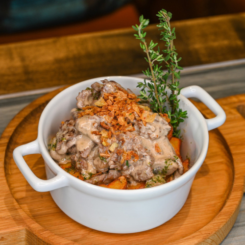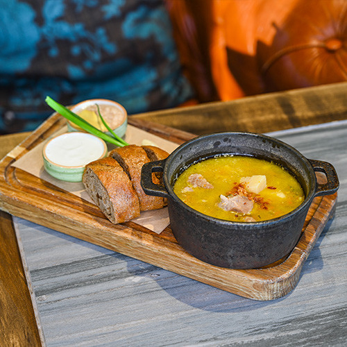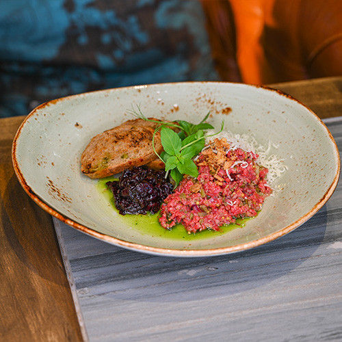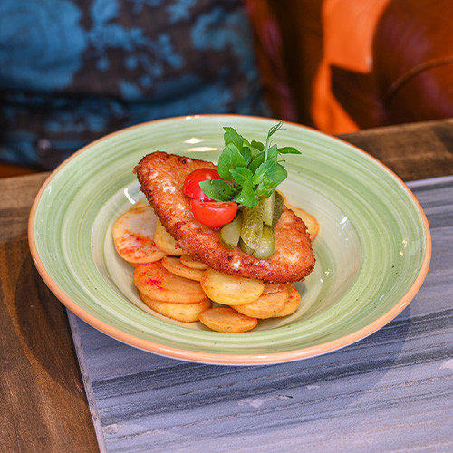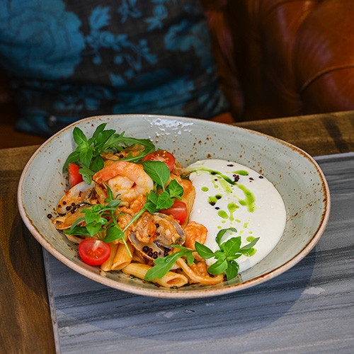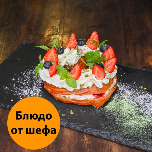 Это блюдо представляет собой лепешку-пиццу, выполненную в итальянском стиле. C ломтиками ароматного бекона, сыр моцарелла, свежие яйца, сливочный соус Альфредо и соус песто. Все вместе создает гармоничное сочетание вкусов и текстур, которое порадует любителей сытных блюд с ярким вкусом.